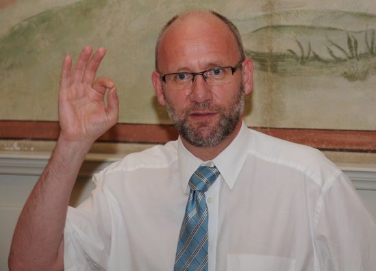Nik Sakellariou informierte in der Remise der Domäne auf dem Hohentwiel über Bürgerbeteiligung.