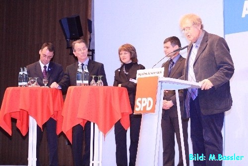 Ein Sozialdemokrat alter Schule: So wurde der SPD- Parteivorsitzende der SPD in Singen wahrgenommen. Eher leise sein Auftritt, aber mit Nachdruck für die gerechte Sache der deutschen Sozialdemokratie sich einsetzend, hat Franz Müntefering in Singen Überzeugungsarbeit leisten können. Seine Ausführungen zur Geschichte der Sozialdemokratie und die Verpflichtung der aktuellen Politik, sich an diesen Grundwerten zu orientieren, waren Schwerpunkt seiner Ausführungen.