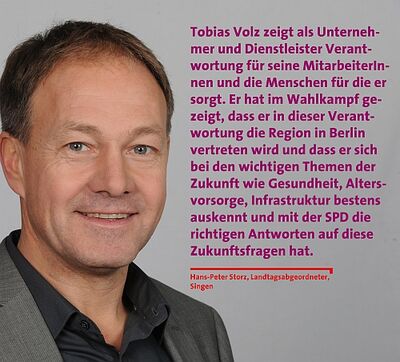 Der 44-jährige Unternehmer Tobias Volz aus Allensbach soll für die SPD im Wahlkreis Konstanz in den Bundestagswahlkampf ziehen. Der Vorstand hatte Volz einstimmig nominiert, berichtet der Kreisvorsitzende, der baden-württembergische Europaminister Peter Friedrich auf einer Pressekonferenz in Konstanz. Die SPD-Mitglieder im Kreis entscheiden am 18. Dezember.